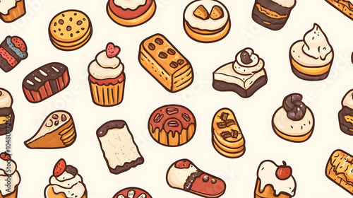 Seamless chocolate pattern featuring various baked goods like cookies, croissants, and donuts, perfect for a sweet-themed background