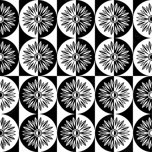 Seamless decorative pattern with a flowers in a circles and contrst black - white colors