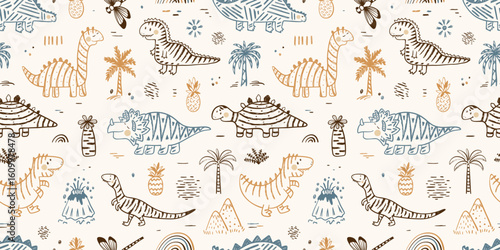 Seamless Dinosaur Pattern - Hand Drawn Striped Cute Dinosaurs in Earth Tones. Kids Fashion Vector Playful Background