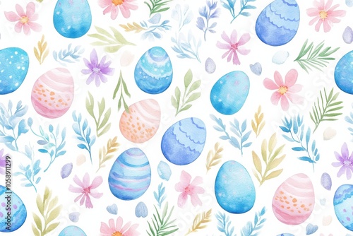 Seamless Easter egg pattern in pastel colors with floral elements, great for spring designs.