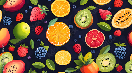 Seamless Easter pattern featuring colorful eggs, flowers, and fruits, perfect for vibrant summer decorations and cheerful wallpaper