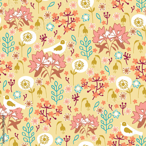 Seamless floral pattern. Flowers and birds on a bright yellow background.
