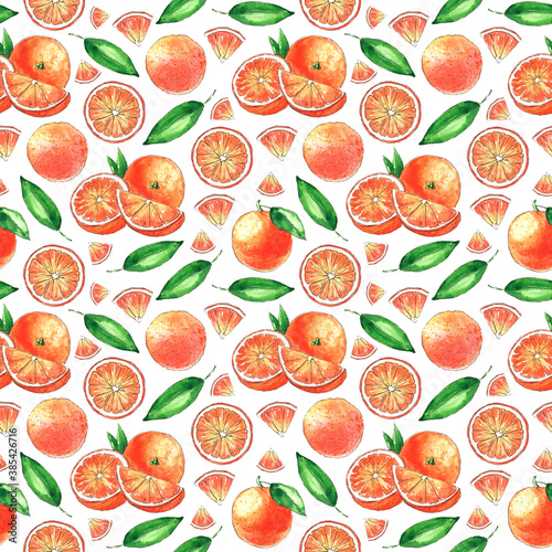 Seamless fruit watercolor pattern with oranges and leaves. Food pattern.