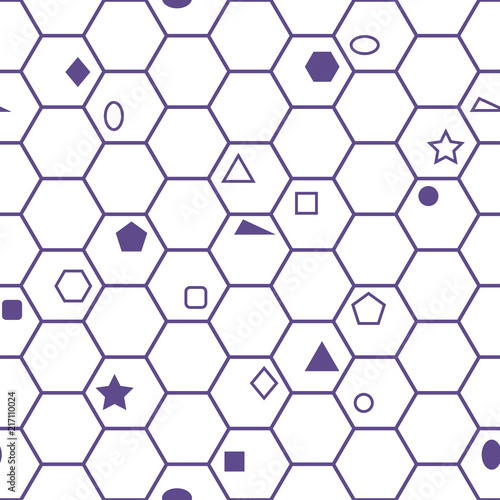 Seamless geometric pattern. Abstract background with different geometric shapes. Honeycombs, hexagon, polygon, star, triangle, square, oval. Pattern for fabric, gift wrapping, paper design, wallpaper,