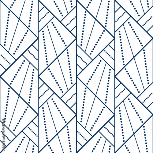 Seamless geometric pattern from lines and dots. Vector decorative square diagonal ornament. Blue pattern on white background. Strict monochrome design. Mosaic tile background for design project.