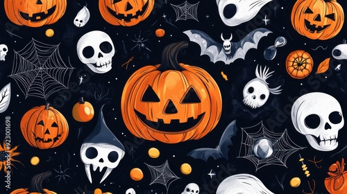 halloween, tile, seamless, pattern, bat, skull, candy, eyeball, skittish, creepy, festive, holiday, decoration, pumpkin, skull, spider's web, horror, background, wallpaper, texture, design, repeat, orange, eerie, monster, skeleton, icon, festival, birthday, isolated, headband, hat, halo, indian, horn, angel, booth, set, celebration, carnival, theatre, pirate, vector, mask, laurel