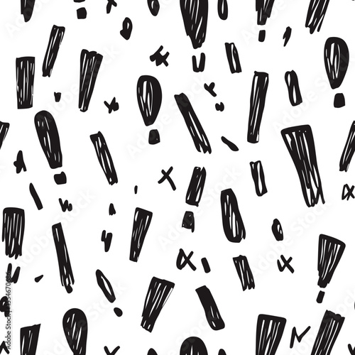 Seamless hand drawn black exclamation marks pattern on white background scribble doodle ink style warning symbol design minimalist vector illustration texture background