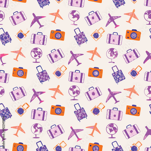 seamless, vector, pattern, pastel, travel, icon, suitcase, map, aeroplane, camera, teal, ivory, beige, background, honed, brand, journey, vacation, adventure, tour tourism, transport, exploration, graphic design, illustration, digital artwork, textile design, wallpaper