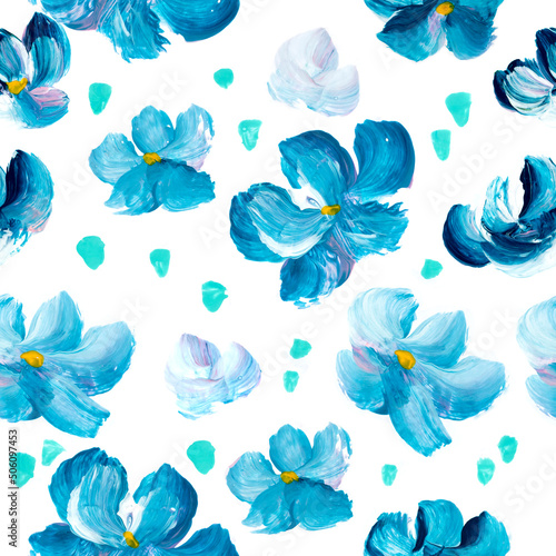 Seamless pattern abstract blue flowers, art painting, creative hand painted background, brush texture, acrylic painting.