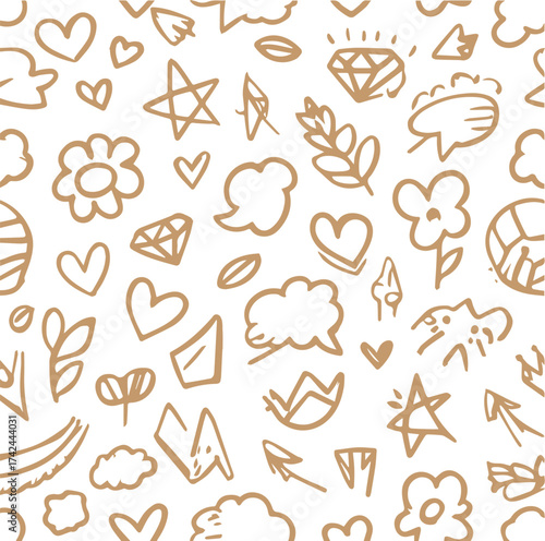 seamless pattern, background, hand-drawn, design element, sketch, flower, heart, star, diamond, leaf, arrow, outline, light, white, brown, creative, wallpaper, fabric, illustration, art, textile, scrapbook, wrapping paper, cute, adorable, drawing, artistic, vector, design, modern, decorative, graphic, simple, abstract, pattern, minimal, vignetting, doodle, linear, line art