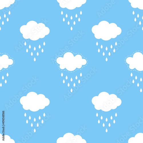 Seamless pattern background with white fluffy cartoon clouds and drops rain on light blue sky. Vector illustration for kids fabric or backdrop.