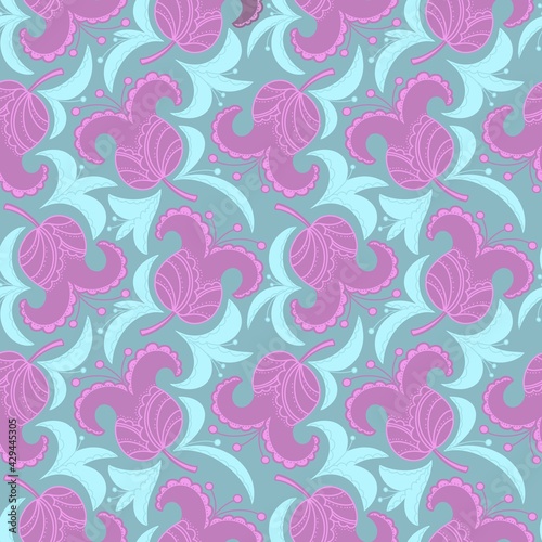 Seamless pattern. Decorative lilac flowers with leaves on a light background