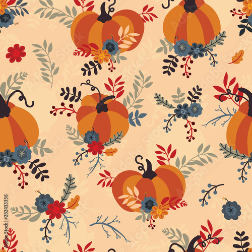 Seamless pattern for thanksgiving celebration. Vector of hand drawn illustration with ripe pumpkin and floral.