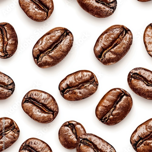 Seamless pattern of coffee beans with realistic texture and rich brown tones, isolated on white background.