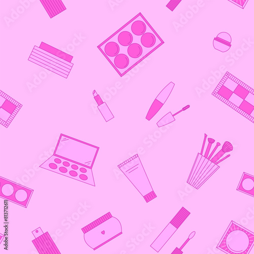 Seamless pattern of decorative cosmetics. Eyeshadow palette, blush, mascara, gloss, lipstick, cream, makeup brushes. Vector illustration