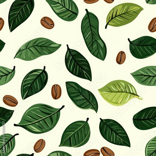 green, leaf, hot drink, bean, pattern, seamless, background, design, illustration, nature, botanical, tropical, plant, brown, white, dark, light, vibrant, organic, texture, graphic, abstract, style, artwork, art, digital, aesthetic, simple, minimal, repeat, creative, element, decor, wallpaper, print