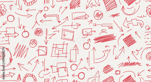 Seamless pattern of hand-drawn red arrows and flowchart elements