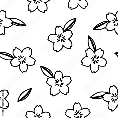 cherry, blossom, sakura, flower, seamless, pattern, floral, japanese, black, and, white, monochrome, simple, minimalist, line, art, outline, vector, background, texture, design, element, spring, nature, illustration, repeat, fabric, wallpaper, surface, graphic, botanical, blossom, style