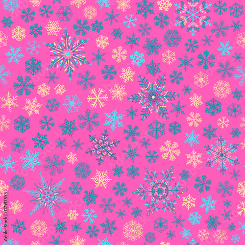 Seamless pattern of snowflakes, blue, light blue and yellow on pink