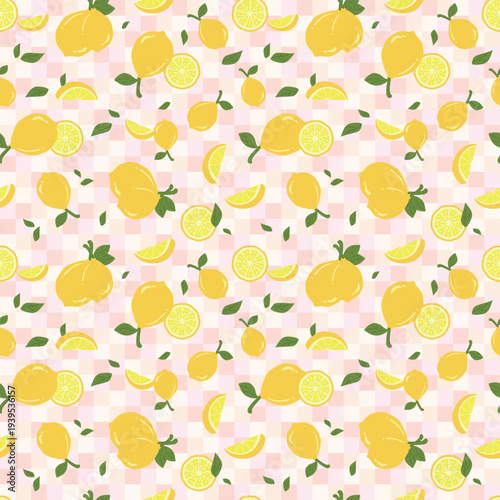 Seamless pattern of whole yellow lemons with fresh-looking lemon slices decorated with green leaves. Pastel colorful checkered background for textiles, curtains, picnic mats, wrapping paper