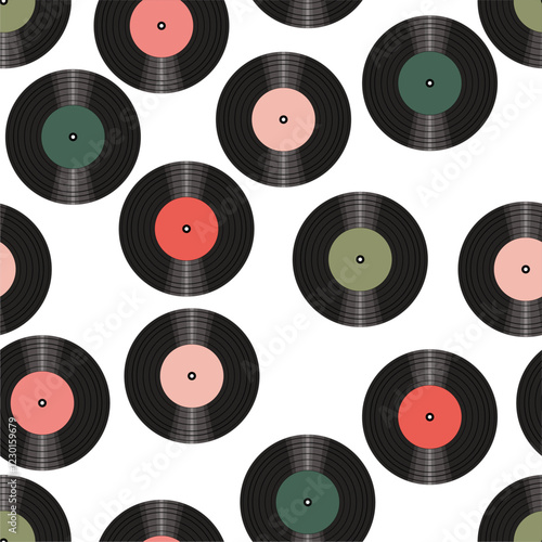 Seamless pattern print wallpaper with vinyl record discs music illustration vector retro style 60s, 70s, 80s, design art background for paper, textile, pack etc.