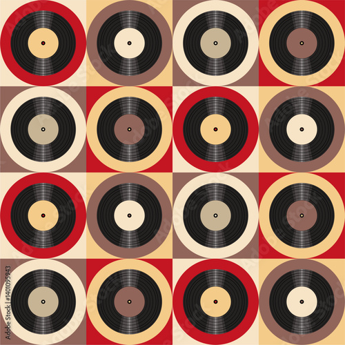 Seamless pattern print wallpaper with vinyl record discs music illustration vector retro style 60s, 70s, 80s, design art background for paper, textile, pack etc.