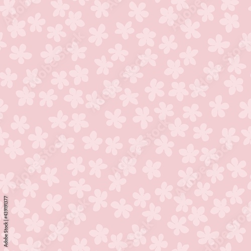 Seamless pattern with blossoming Japanese cherry sakura for fabric, packaging, wallpaper, textile decor, design, invitations, print, gift wrap, manufacturing. Pink flowers on salmon background.