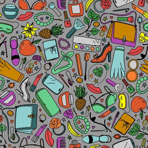 accessory, woman, thing, object, seamless, pattern, fashion, youth, jewellery, perfume, bracelet, apple, pineapple, comb, glove, twig, ring, lipstick, cosmetic, phone, smartphone, bag, clutch, purse, earring, notepad, pen, shoe, heel, sandal, bra, vignetting, vector, illustration, abstract, design, doodle, grey background, grey, print, ornament, fabric, wallpaper, background, bright