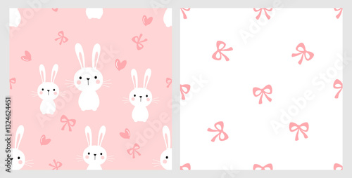 Seamless pattern with bunny rabbit cartoons, hand drawn hearts and ribbon bows on pink and white backgrounds vector.