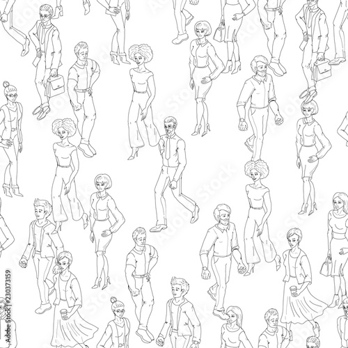 Seamless pattern with business people walking. Sketch black and white outline style illustration with men and woman. Casual street fashion vector.