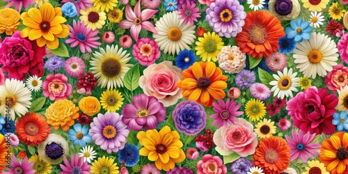 Seamless pattern with colorful blooming flowers, blooms, floral, garden, nature, background, decoration, seamless