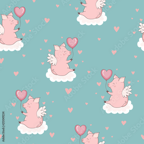 Seamless pattern with cute cupid pigs on the clouds. Valentine day vector illustration.