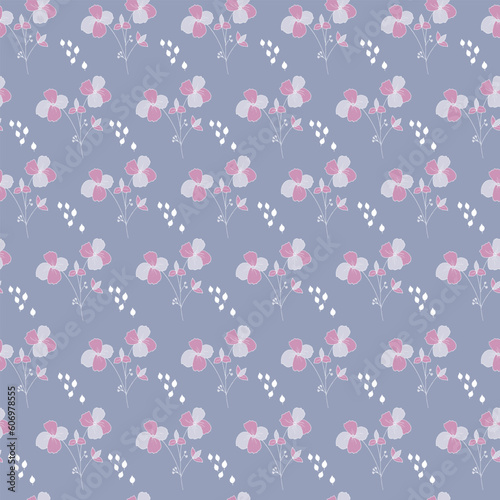 Seamless pattern with cute pink flowers. Hand-drawn ornament on gray background.