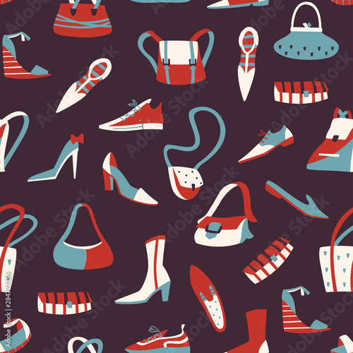 Seamless Pattern with Different Doodle Shoes and Bags. Hand Drawn Vector Illustration.