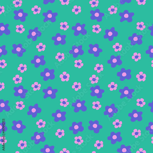 Seamless pattern with flowers. Purple and pink flower seamless on green background.