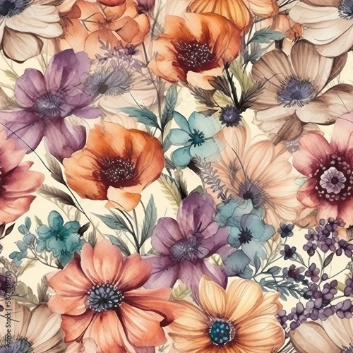 seamless pattern with flowers, water color, generative ai, generative, ai