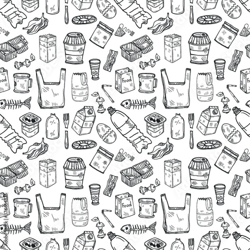 Seamless pattern with hand drawn garbage. Plastic pollution collection. Vector