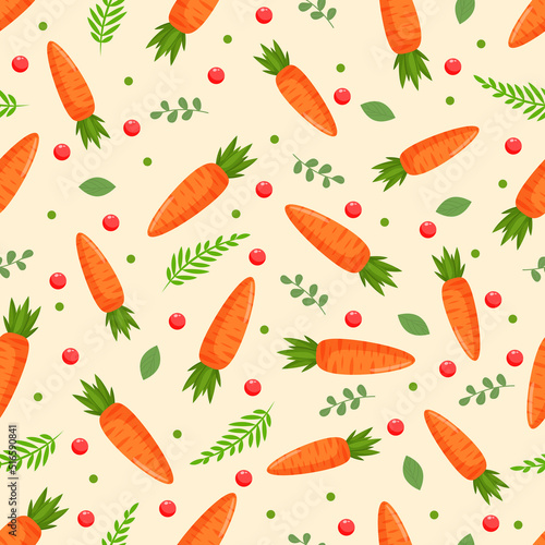 Seamless pattern with orange carrots, green leaves and summer berries. Vector illustration for fabrics, textures, wallpapers, posters, cards. Editable elements.