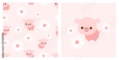 Seamless pattern with pig cartoons and daisy flower on pink background vector.