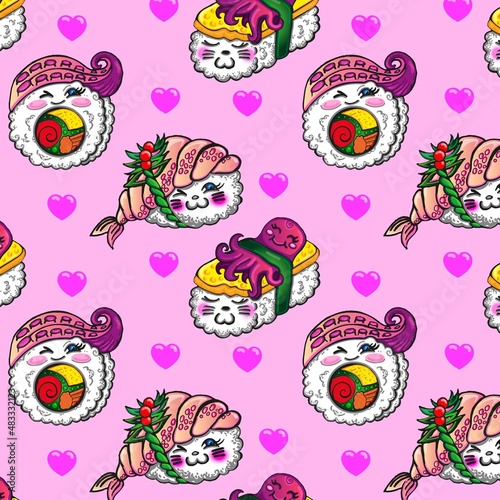 Seamless pattern with pink hearts and cute sushi. Kawaii friendly rolls. Roll with octopus. Nigiri with shrimp. Bright pattern