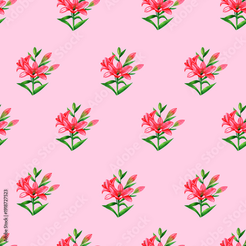 Seamless pattern with pink lilies on pink background, watercolor floral design suitable for wallpaper, cards or fabric.