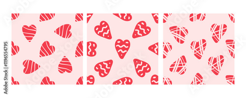 Seamless pattern with red hearts on pink background in doodle style