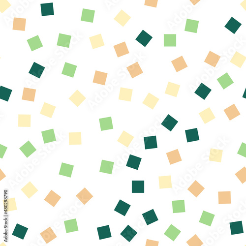 Seamless pattern with squares. Abstract geometric pattern with green and beige squares. Random, chaotic background with cute confetti.