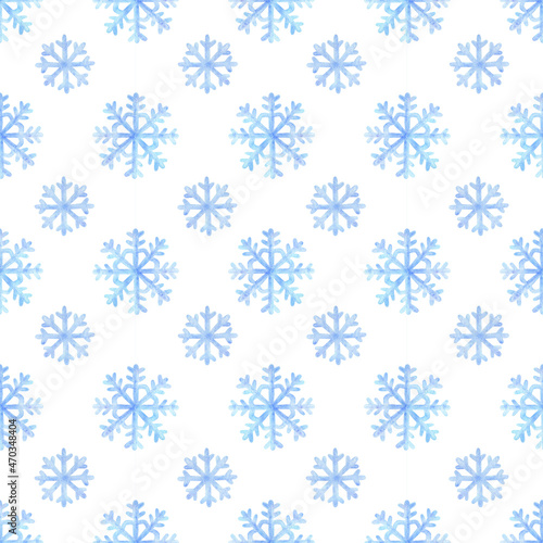 Seamless pattern with watercolor snowflakes of blue color. White background with small snow figures. Winter sample polka dot ornament for fabric, textiles, wallpaper, packaging, print