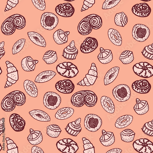 Seamless patterns. Sweets, pastries, cakes, cheesecakes, donuts, eclair, cupcakes, arranged in random order. Design for packaging. Line art in freehand drawing style. Doodle illustration. Vector.