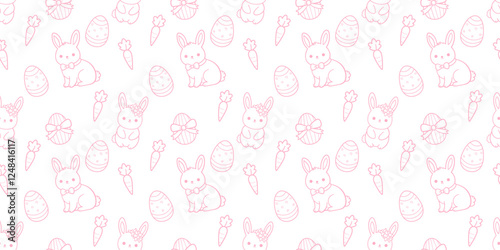 Seamless Pink Easter Bunny Pattern with Decorative Eggs and Carrots, Cute Hand Drawn Vector Background for Spring Design
