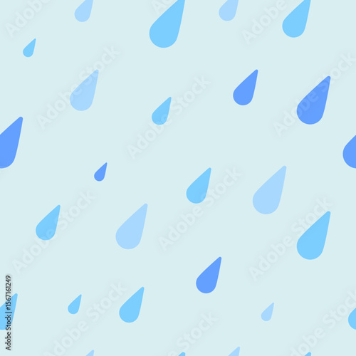Seamless rainy pattern with scattered raindrops in varying shades of blue creates a calming, refreshing background element.