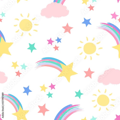Seamless repeat pattern in pastel colors with shooting stars, rainbows, sunshine and clouds