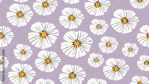 Seamless repeat pattern of white daisy flowers with yellow centers on a light purple background design