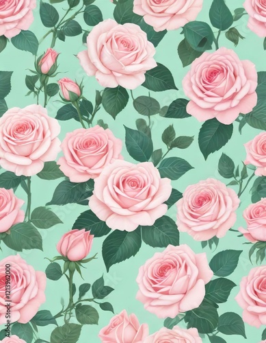 Seamless roses pattern with a hand-drawn look in shades of pastel pink and mint green, roses, pattern